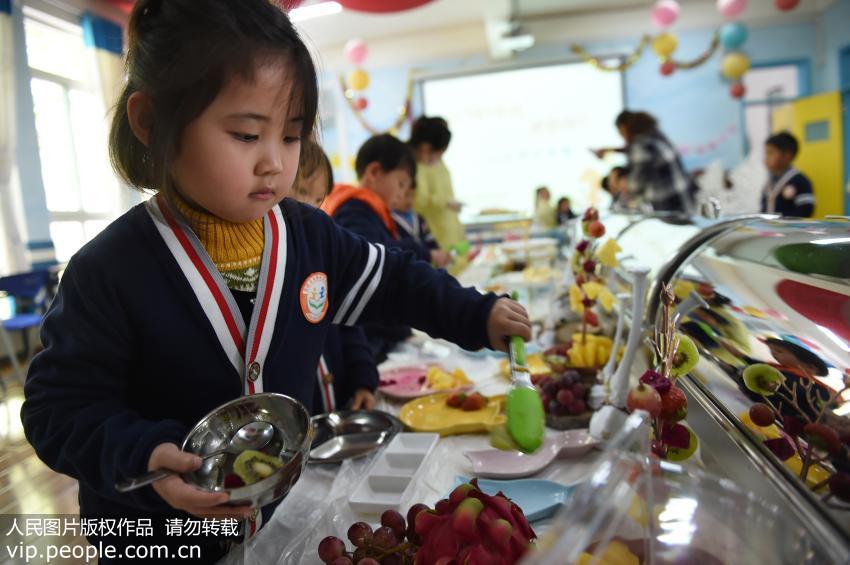 點(diǎn)擊下載本組圖片 4月13日,幼兒園小朋友正在自助選擇自己喜歡的菜肴。(王志強(qiáng)/人民圖片) 【詳細(xì)】