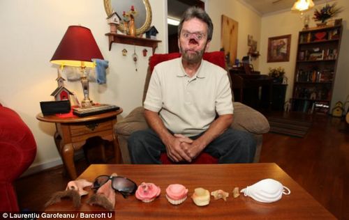 圖為手術(shù)之后的唐尼,需要佩戴假體和面具