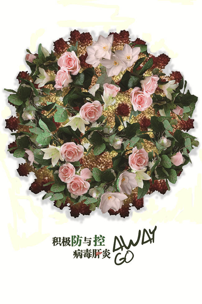 該作品呈現(xiàn)給讀者的是一個被自然、健康、有生命力的花兒們纏繞的乙肝病毒,作者運用年輕活潑的表達形式鼓勵患者積極面對乙肝病毒,并堅信頑強防控的人必將戰(zhàn)勝病毒。(圖文/廈門大學武劉鑫琳)