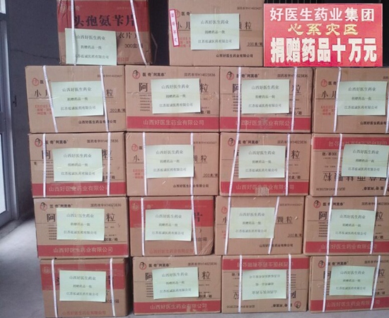 山西好醫(yī)生藥業(yè)當(dāng)?shù)剞k事處人員將迅速將該情況匯報(bào)給總部后,山西好醫(yī)生藥業(yè)有限公司總經(jīng)理劉漢軍遂作出了向?yàn)?zāi)區(qū)支援10萬元藥品的決定。6月26日,山西好醫(yī)生藥業(yè)當(dāng)?shù)剞k事處人員賀定霞、賀定輝在當(dāng)?shù)蒯t(yī)藥公司的幫助下,帶著價(jià)值10萬元的藥品前往災(zāi)區(qū)進(jìn)行捐贈(zèng)。
