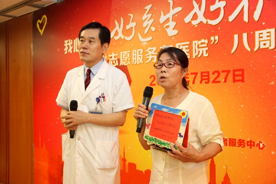 人民網(wǎng)北京7月28日電(陳燁菲) “謝謝您,赫大夫!13年過(guò)去了,可能您的患者太多,已經(jīng)忘記了我,但是我永遠(yuǎn)會(huì)記得您。當(dāng)年我得了肺癌,以為被判了死刑,是您的鼓勵(lì)幫助和精湛醫(yī)術(shù)給了我第二次生命!今天能夠再次有機(jī)會(huì)當(dāng)面感謝您我很激動(dòng)!”一位患者眼中噙著淚水,向時(shí)隔13年再次見(jiàn)到的中國(guó)醫(yī)學(xué)科學(xué)院腫瘤醫(yī)院院長(zhǎng)赫捷院士深深鞠躬。醫(yī)患和諧感人的一幕幕,在昨日由中國(guó)醫(yī)學(xué)科學(xué)院腫瘤醫(yī)院患者服務(wù)中心舉辦的我的好醫(yī)生好護(hù)士主題活動(dòng)暨“志愿服務(wù)在醫(yī)院”八周年總結(jié)活動(dòng)中溫馨上演。