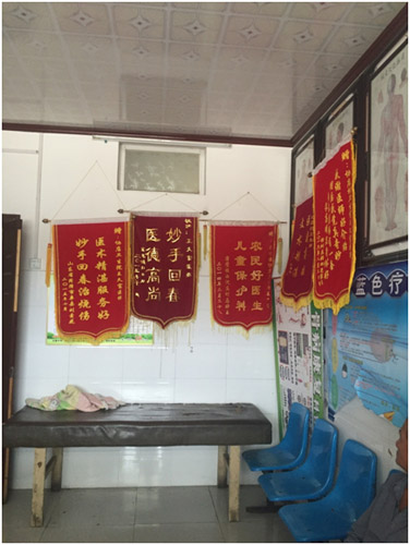圖為診室內(nèi)掛滿了患者為王久富送來的錦旗