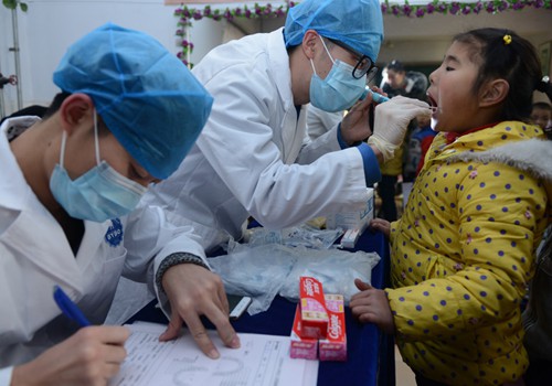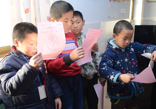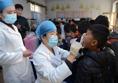 拜博的醫(yī)護人員為西柏坡希望小學(xué)學(xué)生做口腔檢查、免費涂氟