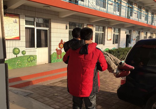 檢查后,拜博志愿者抱一名腿腳不方便的學(xué)生回教室