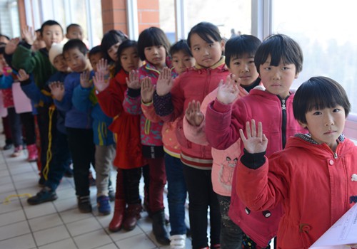 學(xué)生們手拿口腔健康檢查表排隊等候