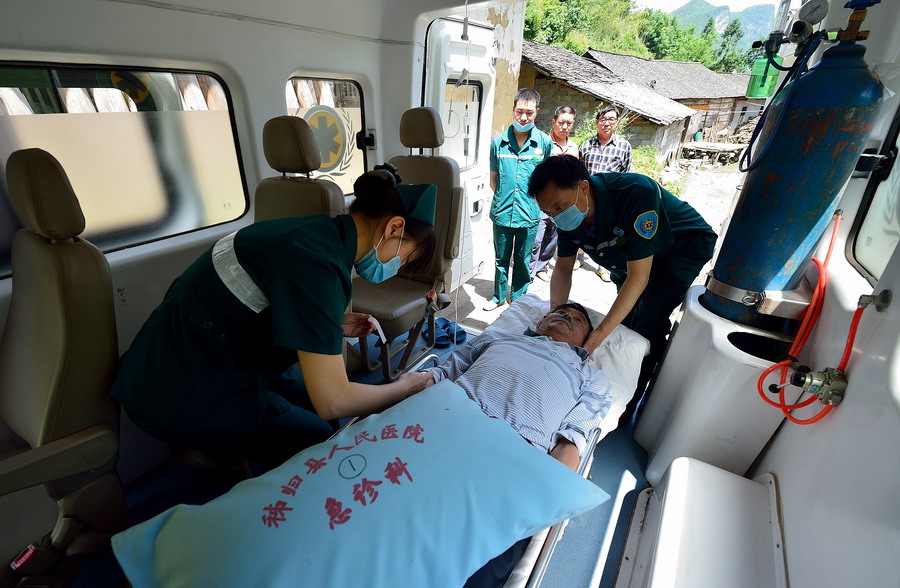 在海拔1100米的湖北省秭歸縣茅坪鎮(zhèn)羅家村,醫(yī)護(hù)人員在車上對突發(fā)中風(fēng)的村民進(jìn)行靜脈輸液等急救措施。(圖片來源:新華社)