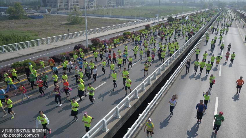 4月23日,航拍參賽選手經(jīng)過揚(yáng)州文昌大橋。(孟德龍/人民圖片)