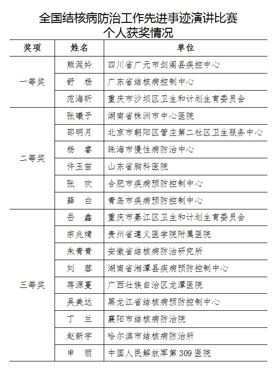 參加決賽的18名選手繪聲繪色地向我們講述一個個用自己的血肉之軀筑起隔絕“疫情”傳播鐵壁銅墻的平凡結(jié)核病防治工作者的故事。經(jīng)過13位評委的專業(yè)評審,四川省廣元市劍閣縣疾控中心熊涎妗、廣東省結(jié)核病控制中心舒楊、重慶市沙壩區(qū)衛(wèi)生和計劃生育委員會范海昕榮獲本次全國結(jié)核病防治工作先進(jìn)事跡演講比賽一等獎,湖南省株洲市中心醫(yī)院張曦予等6位選手獲得二等獎,重慶市綦江區(qū)衛(wèi)生和計劃生育委員會岳鑫等9位選手獲得三等獎。北京結(jié)核病控制研究所、廣東省結(jié)核病控制中心、四川省疾病預(yù)防控制中心、湖南省防癆協(xié)會、重慶市防癆協(xié)會、安徽省防癆協(xié)會、黑龍江省結(jié)核病預(yù)防控制中心和山東省防癆協(xié)會獲得優(yōu)秀組織獎。