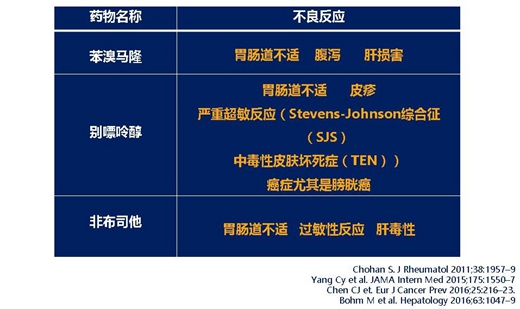 目前,臨床降尿酸藥物主要分為三類(lèi):抑制尿酸生成(以別嘌呤為嘌呤類(lèi)代表,以非布司他為非嘌呤類(lèi)代表);促進(jìn)尿酸排泄(以苯溴馬隆、丙磺舒、苯磺唑酮為代表促進(jìn)尿酸腎臟排泄藥,以活性炭類(lèi)吸附劑為代表的促尿酸腸道排泄藥);促進(jìn)尿酸分解的藥物(以尿酸氧化酶為代表)。降尿酸藥物副作用比較大,例如別嘌呤醇可引起Stevens-Johnson綜合征(嚴(yán)重超敏反應(yīng))和TEN(中毒性皮膚壞死癥),主要引起皮膚剝脫和粘膜的破壞,還會(huì)累及到器官系統(tǒng),死亡率高。因此,不推薦無(wú)癥狀HUA者服用!