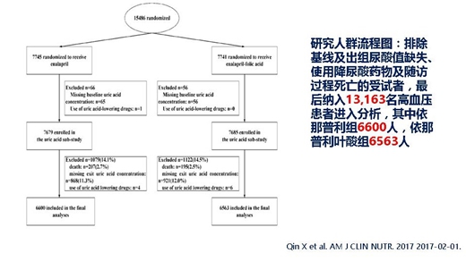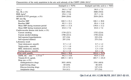 2017年,我國(guó)科研工作者在A(yíng)M J CLIN NUTR撰文指出,以在高血壓人群中探索葉酸治療對(duì)降低血尿酸水平的療效為研究目的,以一項(xiàng)隨機(jī)對(duì)照雙盲臨床試驗(yàn),納入20個(gè)社區(qū)的高血壓人群,隨機(jī)分配至依那普利組(每日口服10毫克依那普利)和依那普利葉酸組(每日口服10毫克依那普利和0.8毫克葉酸),平均隨訪(fǎng)4.5年為研究設(shè)計(jì),以尿酸濃度的變化,定義為出組尿酸濃度-基線(xiàn)尿酸濃度為首要終點(diǎn)事件,以高尿酸血癥控制率,定義為治療后尿酸濃度<357mmol/L,新發(fā)高尿酸血癥,定義為基線(xiàn)尿酸濃度正常(<357mmol/L)并且出組尿酸濃度在男性中≥417 mmol/L(7 mg/dL) 或在女性中≥357 mmol/L (6 mg/dL)為次要終點(diǎn)事件。排除基線(xiàn)及出組尿酸值缺失、使用降尿酸藥物及隨訪(fǎng)過(guò)程死亡的受試者,最后納入13,163名高血壓患者進(jìn)入分析,其中依那普利組6600人,依那普利葉酸組6563人。