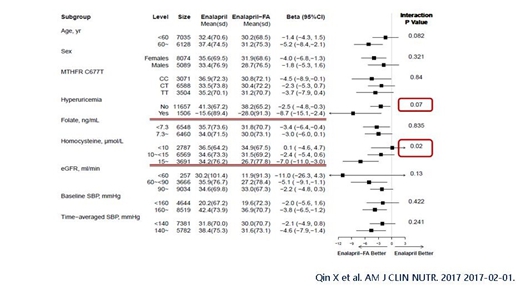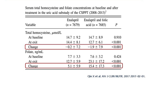 相比依那普利組,依葉組tHcy(總Hcy)水平顯著下降:對(duì)照組下降﹣0.2±7.2?mol/L,試驗(yàn)組下降﹣1.9±7.9?mol/L;治療后,依那普利組和依葉組葉酸濃度分別平均增加5.1和15.4 ng / mL。兩組間基線(xiàn)tHcy和葉酸是完全可比的,經(jīng)過(guò)治療患者,血清總Hcy及葉酸濃度,對(duì)照組、試驗(yàn)組出現(xiàn)明顯分化。