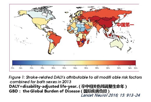 根據(jù)2016年國(guó)際疾病負(fù)擔(dān)組(GBD)公布的188個(gè)國(guó)家和地區(qū)卒中危險(xiǎn)因素排行。從可控危險(xiǎn)因素上,中國(guó)是卒中相關(guān)傷殘調(diào)整生命年(DALY)貢獻(xiàn)最大的國(guó)家。加強(qiáng)危險(xiǎn)因素控制和一級(jí)預(yù)防仍然是中國(guó)面臨的最大問(wèn)題。這一研究成果刊登在2016年出版的Lancet Neutral上面,相關(guān)數(shù)據(jù)來(lái)源于2013年。