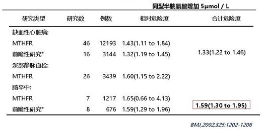 由于Hcy在動(dòng)脈粥樣硬化的啟動(dòng)與發(fā)展中具有顯著地位,有關(guān)同型半胱氨酸與心腦血管事件的關(guān)聯(lián)性,在全世界范圍內(nèi)進(jìn)行了深入研究。2002年,BMJ(英國(guó)醫(yī)學(xué)雜志)上刊登了一篇薈萃分析,該文章對(duì)多項(xiàng)大型藥物遺傳學(xué)及前瞻性研究進(jìn)行了科學(xué)嚴(yán)謹(jǐn)?shù)姆治。結(jié)果顯示:Hcy每升高5?mol/L,腦卒中風(fēng)險(xiǎn)升高59%,缺血型心臟病風(fēng)險(xiǎn)升高33%,血漿中Hcy水平的升高與腦卒中的更為密切。