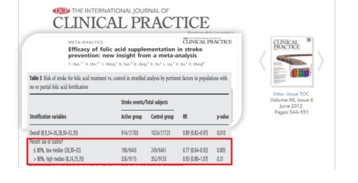 2012年,霍勇等在醫(yī)學(xué)類國(guó)際期刊IJCP撰文META分析指出,補(bǔ)充葉酸降低腦卒中風(fēng)險(xiǎn)的受益可能受他汀類藥物使用的影響。而另一篇META分析中,他汀類藥物的使用有可能掩蓋了葉酸補(bǔ)充降低腦卒中風(fēng)險(xiǎn)的受益。