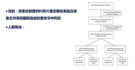 我們研究目的就是:探索葉酸補(bǔ)充是否減低高血壓患者合并膽固醇增高相關(guān)的首發(fā)腦卒中。首先,我們對(duì)研究人群進(jìn)行篩選,從全部的20702人中,剔除服用降脂治療的166人和370個(gè)基線總膽固醇確實(shí)的患者,剩下20166名患者根據(jù)總膽固醇是否≥5.2進(jìn)行分組。每個(gè)組中對(duì)是否服用依那普利葉酸片進(jìn)行觀察研究。隨機(jī)、平行、對(duì)照、雙盲的原則分組,采用依那普利葉酸片10.8mg/d作為治療組;依那普利10mg/d作為對(duì)照組,中位隨訪時(shí)間4.5年,以首發(fā)腦卒中作為首要終點(diǎn),以首發(fā)缺血性卒中(致命或非致命)、首發(fā)出血性卒中(致命或非致命)、復(fù)合心血管事件(包括心因性死亡、心肌梗塞、卒中)作為次要終點(diǎn)。