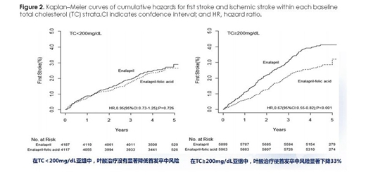 2. 在依那普利對(duì)照組,TC高低組之間,腦卒中發(fā)生率會(huì)有顯著性的統(tǒng)計(jì)學(xué)差異;在依那普利葉酸片治療組,腦卒中發(fā)生率在TC高低組之間差異不明顯,提示依那普利葉酸片有可能對(duì)于總膽固醇升高的高血壓患者的卒中預(yù)防也起到關(guān)鍵的作用。