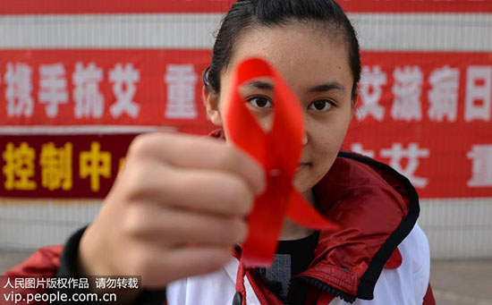 2016年11月30日,河北工程大學的大學生志愿者展示制作的紅絲帶。(郝群英/人民圖片)