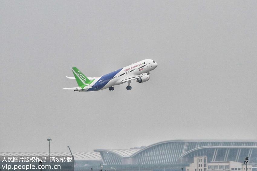 2017年5月5日,我國自行研制的大型客機C919首架機從上海浦東機場成功起飛,開始它的第一次離地飛行。(王初/人民圖片)