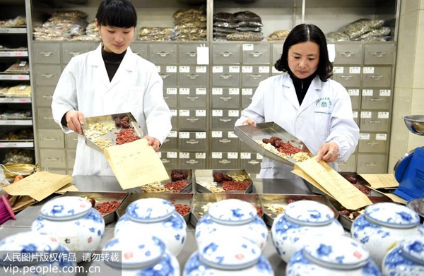 2016年12月20日,安徽省亳州市人民醫(yī)院中藥房的醫(yī)務(wù)人員在為市民配制進(jìn)補(bǔ)用的中草藥。(劉勤利/人民圖片)