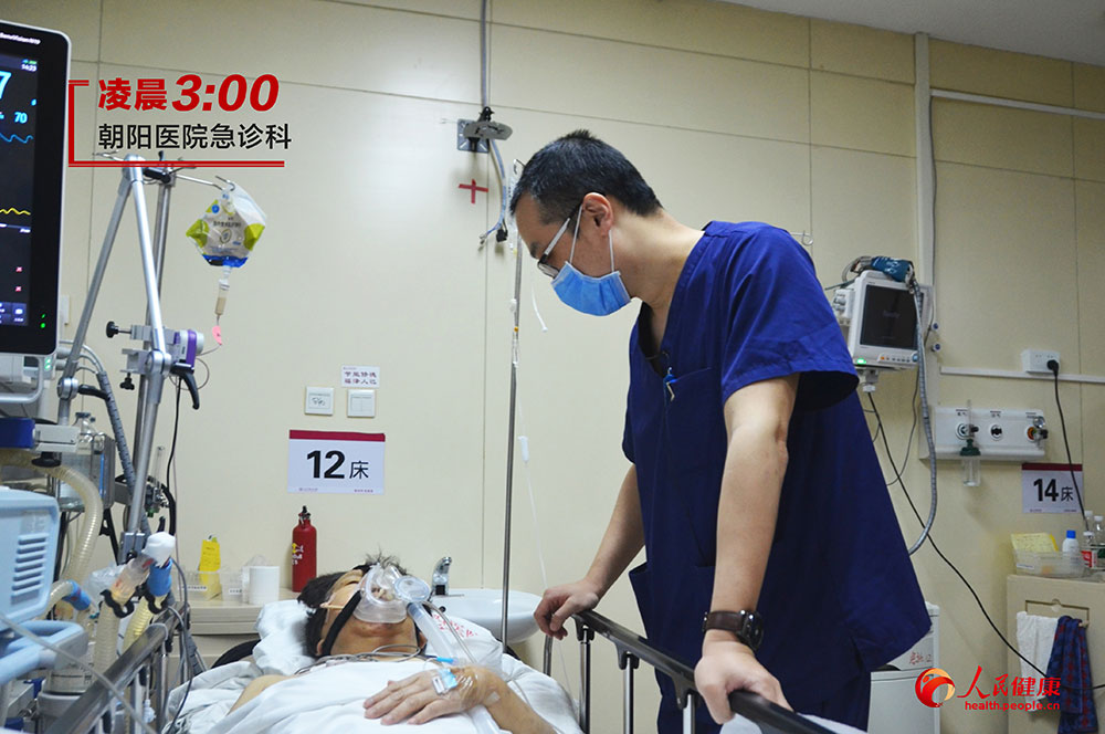 凌晨3點的朝陽醫(yī)院急診科,醫(yī)生袁偉正在查看病人情況/王國菁攝