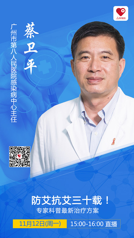 11月12日(周一)15:00-16:00,廣州市第八人民醫(yī)院感染病中心主任蔡衛(wèi)平將在“人民好醫(yī)生”App進行科普直播,并在線解答大家關(guān)于艾滋病的各種困惑,別錯過哦!