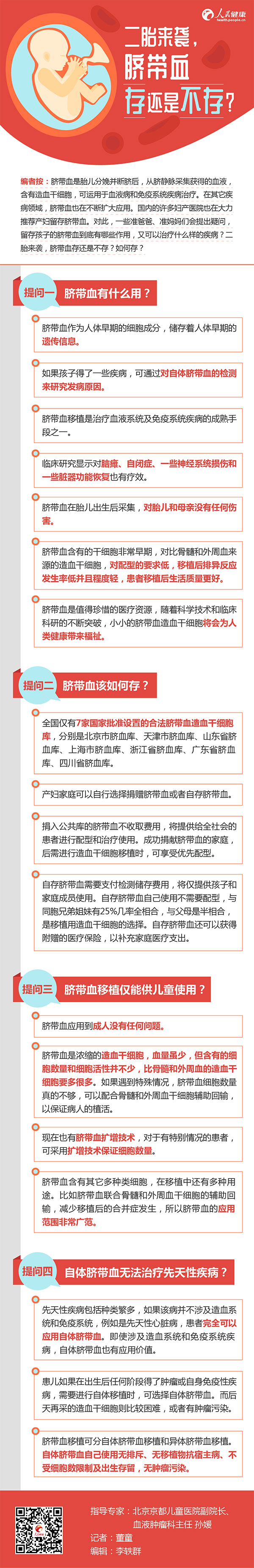 編者按:臍帶血是胎兒分娩并斷臍后,從臍靜脈采集獲得的血液,含有造血干細(xì)胞,可運(yùn)用于血液病和免疫系統(tǒng)疾病治療。在其它疾病領(lǐng)域,臍帶血也在不斷擴(kuò)大應(yīng)用。國內(nèi)的許多婦產(chǎn)醫(yī)院也在大力推薦產(chǎn)婦留存臍帶血。對此,一些準(zhǔn)爸爸、準(zhǔn)媽媽們會提出疑問,留存孩子的臍帶血到底有哪些作用,又可以治療什么樣的疾病?二胎來襲,臍帶血存還是不存?如何存?