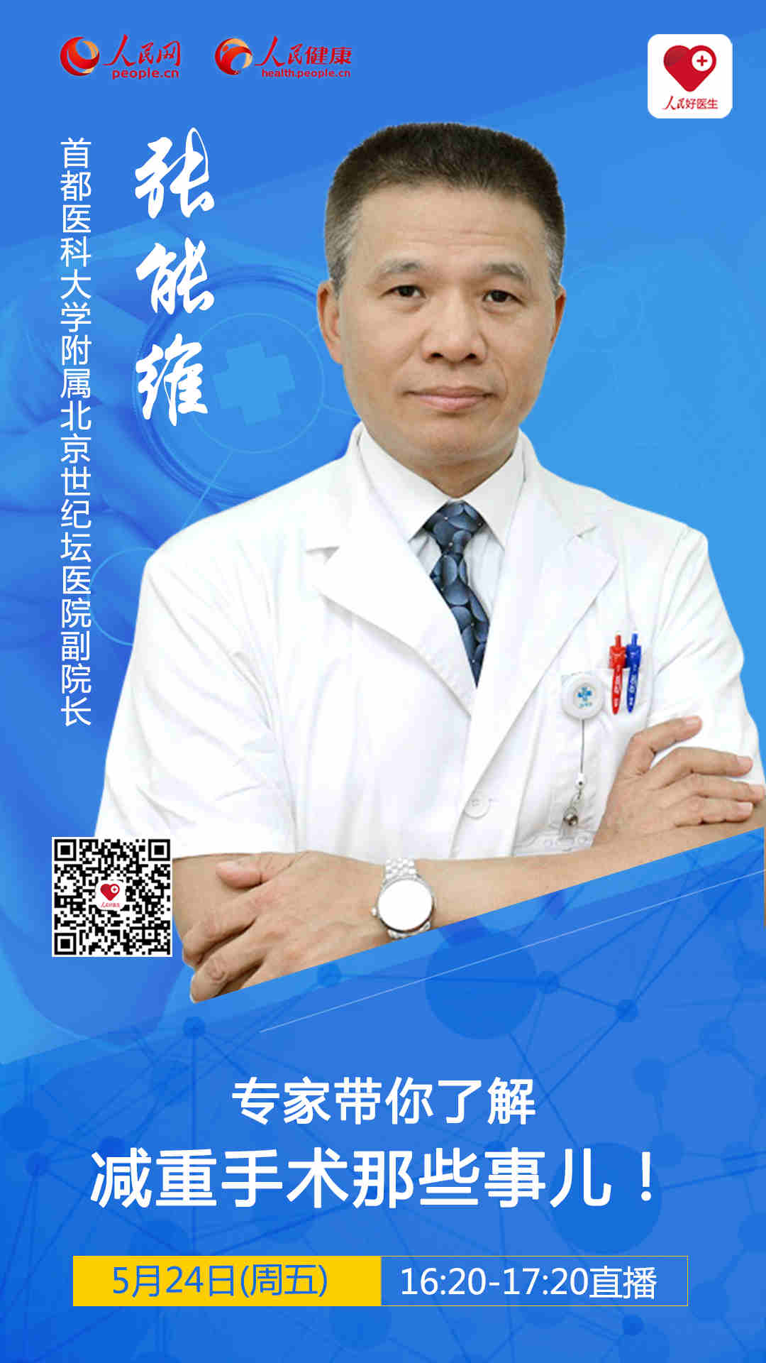 減重手術(shù)的原理是什么?哪些人可以選擇,術(shù)后又該如何護(hù)理?2019年5月24號(hào)(周五)16:20-17:20,首都醫(yī)科大學(xué)附屬北京世紀(jì)壇醫(yī)院副院長(zhǎng) 張能維將在“人民好醫(yī)生”App進(jìn)行科普直播,并在線解答大家的各種困惑,歡迎掃碼觀看!