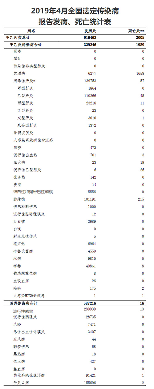 附:2019年4月全國法定傳染病報告發(fā)病、死亡統(tǒng)計表