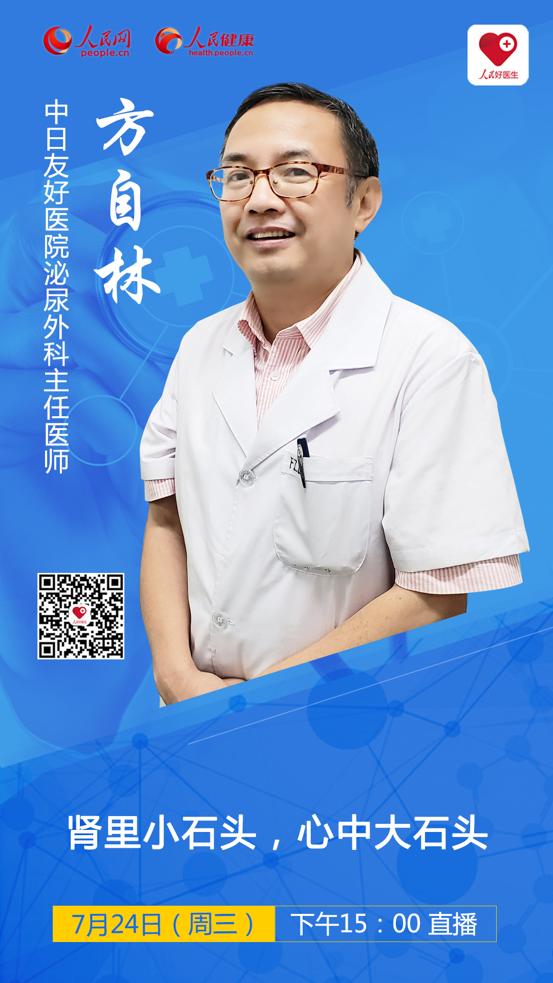 2019年7月24日(周三)下午15:00,“人民好醫(yī)生”客戶端將邀請中日友好醫(yī)院泌尿外科主任醫(yī)師方自林進行視頻和圖文直播,詳細講解腎結石形成的原因、癥狀及治療。并在線解答廣大網(wǎng)友相關問題,千萬不要錯過!