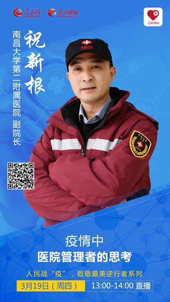 2020年3月19日(周四)13:00-14:00,“人民好醫(yī)生”客戶端邀請(qǐng)到南昌大學(xué)第二附屬醫(yī)院副院長(zhǎng)、江西首批援鄂醫(yī)療隊(duì)隊(duì)長(zhǎng) 祝新根進(jìn)行視頻直播,與您分享疫情中醫(yī)院管理者的思考。
