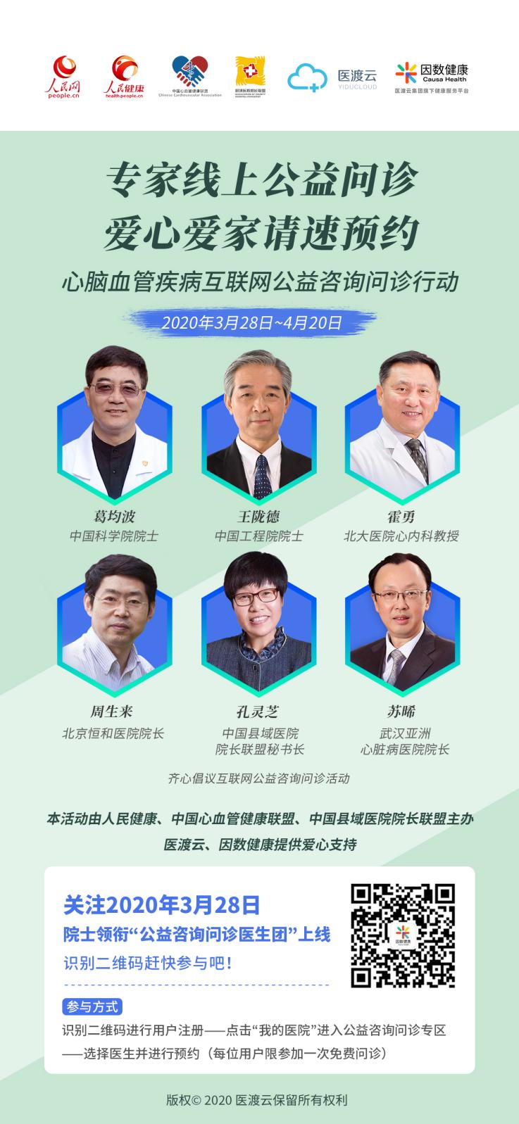 據(jù)了解,此次心腦血管疾病互聯(lián)網(wǎng)健康公益咨詢問(wèn)診行動(dòng),在中國(guó)科學(xué)院、中國(guó)心血管健康聯(lián)盟主席、上海復(fù)旦大學(xué)附屬中山醫(yī)院葛均波院士號(hào)召下,中國(guó)縣域醫(yī)院院長(zhǎng)聯(lián)盟執(zhí)行主席、北大醫(yī)院心內(nèi)科、心臟中心霍勇教授,江蘇省人民醫(yī)院孔祥清教授,廣東省南方醫(yī)院吳平生教授,中國(guó)心血管健康聯(lián)盟秘書(shū)長(zhǎng)方唯一教授,北京協(xié)和醫(yī)院王崇慧教授,北京天壇醫(yī)院徐東教授,武漢協(xié)和醫(yī)院黃愷教授,蘭州大學(xué)第一醫(yī)院張鉦教授等專(zhuān)家已經(jīng)應(yīng)邀參加并初步確認(rèn)了咨詢問(wèn)診時(shí)間,同時(shí)更多專(zhuān)家將陸續(xù)加入到這次公益咨詢問(wèn)診行動(dòng)中。