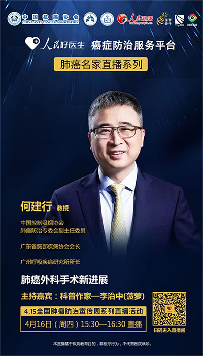 2020年4月16日(周四)15:30-16:30,人民好醫(yī)生客戶端邀請(qǐng)到中國(guó)控制吸煙協(xié)會(huì)肺癌防治專委會(huì)副主任委員、廣東省胸部疾病協(xié)會(huì)會(huì)長(zhǎng)、廣州呼吸疾病研究所所長(zhǎng)何建行進(jìn)行視頻直播訪談,在線分享肺癌外科手術(shù)新進(jìn)展。