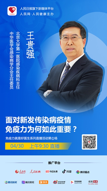 為了科普免疫力的重要性,人民日報社旗下新媒體“人民好醫(yī)生”客戶端特別策劃“免疫力就是好醫(yī)生系列直播活動”。2020年4月30日上午9:30,北京大學第一醫(yī)院感染疾病科主任、中華醫(yī)學會感染病學分會主任委員王貴強教授將進行系列活動的第一場視頻訪談,歡迎屆時收看。
