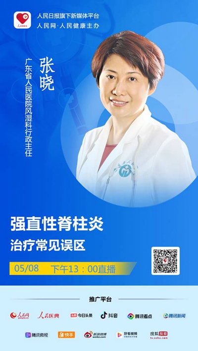 強直性脊柱炎是以侵犯骶髂關(guān)節(jié)和脊柱為主要臨床表現(xiàn)的炎癥性關(guān)節(jié)炎,常見于年輕男性,對患者的勞動能力、形象和生活都會帶來一定程度的困擾。強直性脊柱炎主要侵犯人體脊柱,早期主要癥狀為下腰部疼痛,嚴(yán)重時會出現(xiàn)如背部僵直這樣的癥狀,故稱之為強直性脊柱炎。但目前,人們對強直性脊柱炎的治療認(rèn)識存在諸多誤區(qū),導(dǎo)致治療依從性差和效果不佳等情況出現(xiàn),如該病究竟是否可以根治,是否存在特效藥,偏方是否可信等?2020年5月8日(星期五)13:00-14:00,“人民好醫(yī)生”客戶端將邀請廣東省人民醫(yī)院風(fēng)濕科行政主任張曉教授進(jìn)行視頻直播,與您探討強直性脊柱炎治療的常見誤區(qū)有哪些。