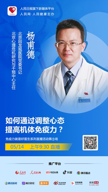 2020年5月14日(周四)上午9:30,人民日報社旗下新媒體“人民好醫(yī)生”客戶端將邀請北京回龍觀醫(yī)院黨委書記、北京心理危機(jī)研究與干預(yù)中心主任楊甫德教授進(jìn)行視頻訪談,與大家在線分享提高機(jī)體免疫力的方法。