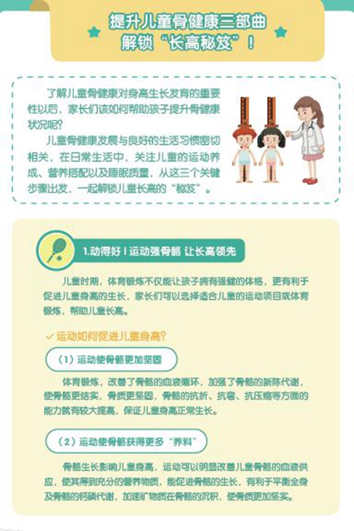 專家們在《兒童骨健康提升指導(dǎo)手冊》中特別指出:兒童骨健康與良好的生活習(xí)慣密切相關(guān)。在日常生活中,家長們要重點關(guān)注兒童的運動養(yǎng)成、營養(yǎng)搭配以及睡眠質(zhì)量,掌握好提升兒童骨健康三部曲,助力兒童健康成長。