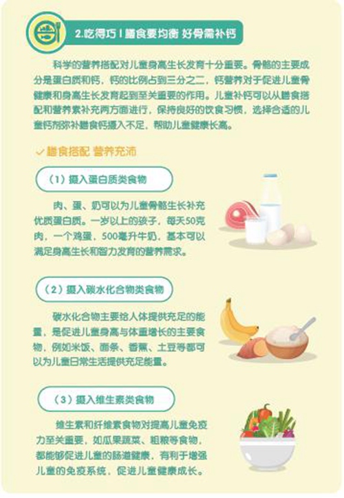 兒童的骨骼健康和發(fā)育必須要有均衡的營養(yǎng)。骨骼的形成主要是蛋白質(zhì)和鈣,鈣的比例占了三分之二,鈣營養(yǎng)對于促進兒童骨健康和身高生長發(fā)育有著至關(guān)重要的作用!吨袊鴥和}營養(yǎng)專家共識(2019)》明顯指出,青少年時期鈣攝入與兒童身高的快速增長有關(guān),鈣攝入量低于300mg/天會導(dǎo)致成年后身材矮小。