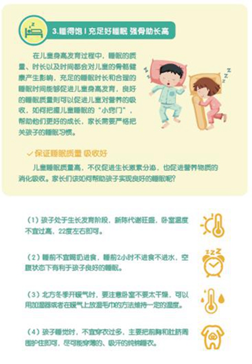 在兒童身高發(fā)育過程中,睡眠的質(zhì)量、時長也會影響骨骼健康和身高。絕大多數(shù)生長激素都在夜間分泌,晚上11點至凌晨1點達到最高峰值。而中學(xué)生每天要睡8小時;小學(xué)生9小時;幼兒園小朋友則需要保障10小時睡眠。一般從入睡到進入深度睡眠大概需要1-2小時,因此建議兒童在10點之前睡覺,讓兩個生長激素分泌的高峰期吻合,促使生長激素分泌達到理想峰值,有助于骨骼健康和長高。