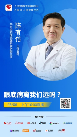 2020年6月6日(周六)上午10:00,人民日?qǐng)?bào)社旗下新媒體“人民好醫(yī)生”客戶端將邀請(qǐng)北京協(xié)和醫(yī)院眼科常務(wù)副主任陳有信教授進(jìn)行視頻訪談,與大家在線分享眼底病的防治措施。