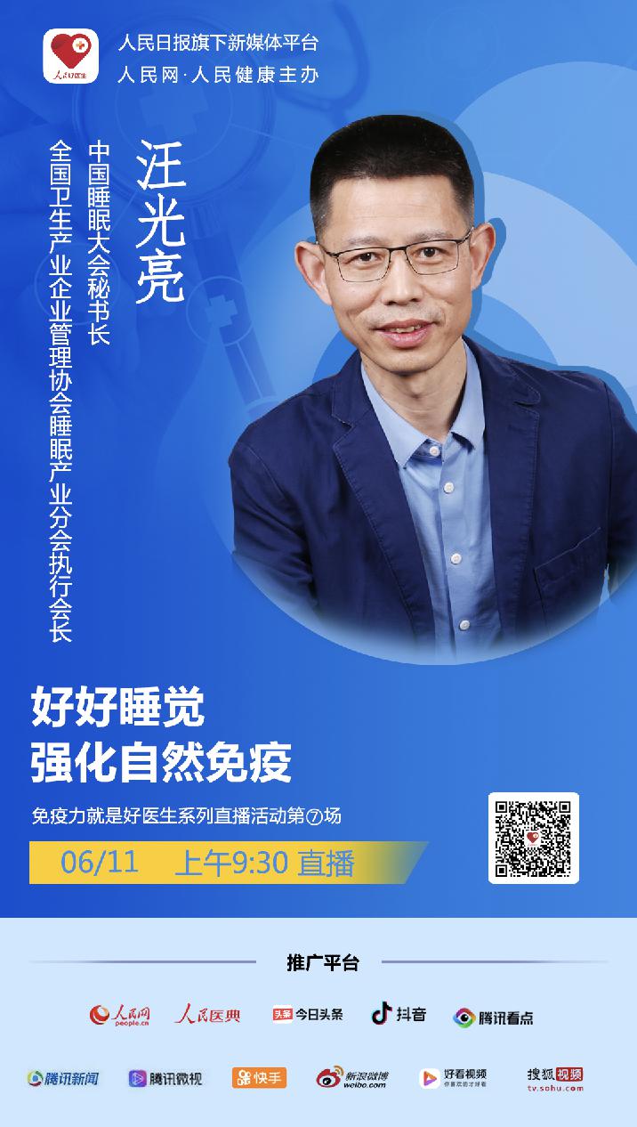 2020年6月11日(周四)上午9:30,人民日報(bào)社旗下新媒體“人民好醫(yī)生”客戶端將邀請中國睡眠大會秘書長、全國衛(wèi)生產(chǎn)業(yè)企業(yè)管理協(xié)會睡眠產(chǎn)業(yè)分會執(zhí)行會長汪光亮進(jìn)行視頻訪談,與大家在線分享如何通過調(diào)節(jié)睡眠強(qiáng)化自然免疫。