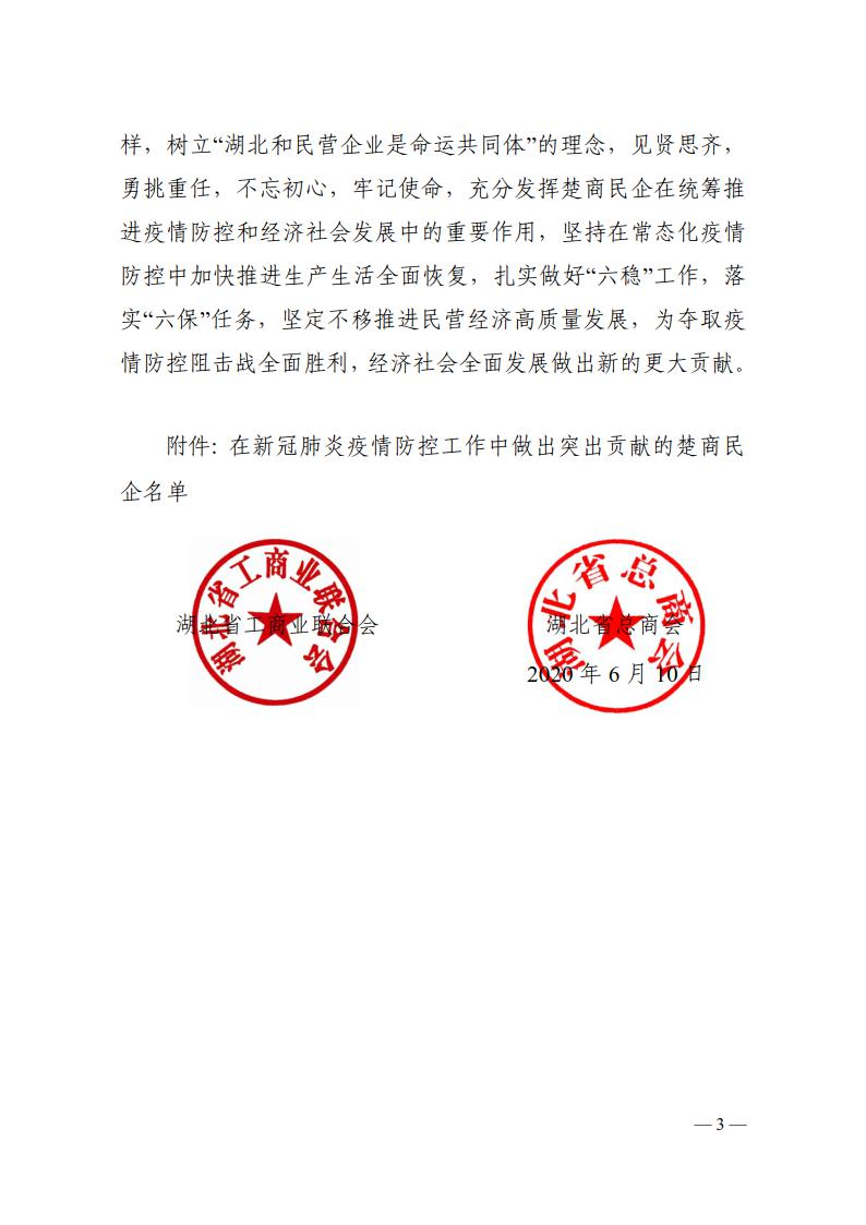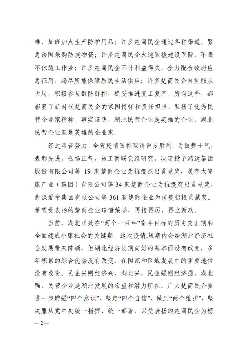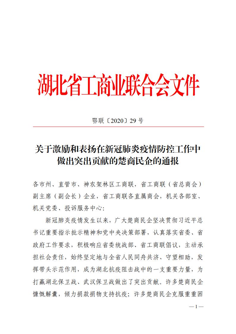 近日,湖北省工商聯(lián)(總商會(huì))十二屆四次執(zhí)委會(huì)召開,從會(huì)上獲悉,在此次抗擊新冠肺炎疫情中,廣大楚商民企成為湖北抗疫阻擊戰(zhàn)中一支重要力量,楚商民企捐款捐物達(dá)15.88億元,彰顯了新時(shí)代楚商的責(zé)任擔(dān)當(dāng)和家國情懷。為鼓舞士氣,表彰先進(jìn),弘揚(yáng)正氣,省工商聯(lián)黨組研究,決定授予運(yùn)鴻集團(tuán)股份有限公司等19家楚商民企為抗疫杰出貢獻(xiàn)獎(jiǎng),美年大健康產(chǎn)業(yè)(集團(tuán))有限公司等34家楚商民企為抗疫突出貢獻(xiàn)獎(jiǎng),武漢愛帝集團(tuán)有限公司等361家楚商民企為抗疫積極貢獻(xiàn)獎(jiǎng)。