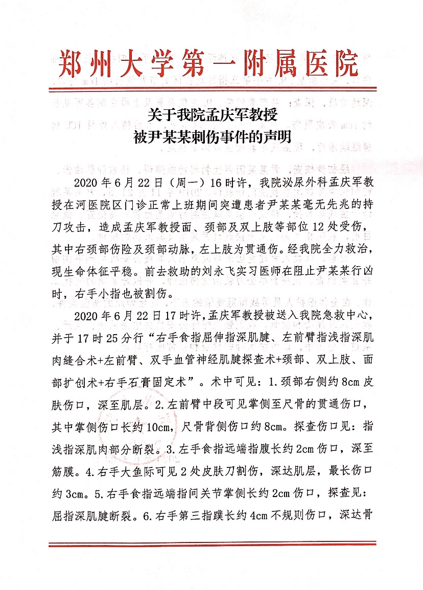 鄭大一附院兩醫(yī)生出診時被砍傷 醫(yī)院發(fā)布官方聲明