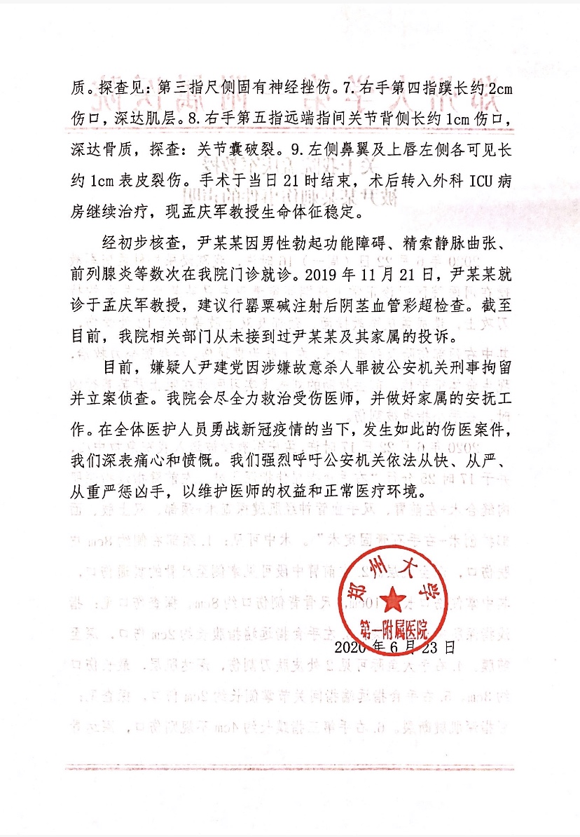 人民網(wǎng)北京6月24日電 河南省鄭州大學(xué)第一附屬醫(yī)院官網(wǎng)發(fā)布聲明稱,22日16時許,泌尿外科醫(yī)院兩名醫(yī)生在正常門診上班期間被砍傷。其中,孟慶軍醫(yī)生面、頸部及雙上肢等部位12處受傷,右頸部傷險及頸部動脈,左上肢為貫通傷。前去救助的劉永飛實習(xí)醫(yī)師在阻止行兇患者時,右手小指也被割傷。醫(yī)院當即對受傷醫(yī)生全力救治。孟慶軍醫(yī)生當日被送入醫(yī)院急救中心進行手術(shù),術(shù)后轉(zhuǎn)入ICU繼續(xù)治療,現(xiàn)在生命體征平穩(wěn)。經(jīng)初步核查,行兇患者尹某某曾在去年就診于孟慶軍醫(yī)生,截止目前,院方從未接到尹某某及其家屬的投訴。目前,嫌疑人尹某某因涉嫌故意殺人罪被公安機關(guān)刑事拘留并立案偵查。