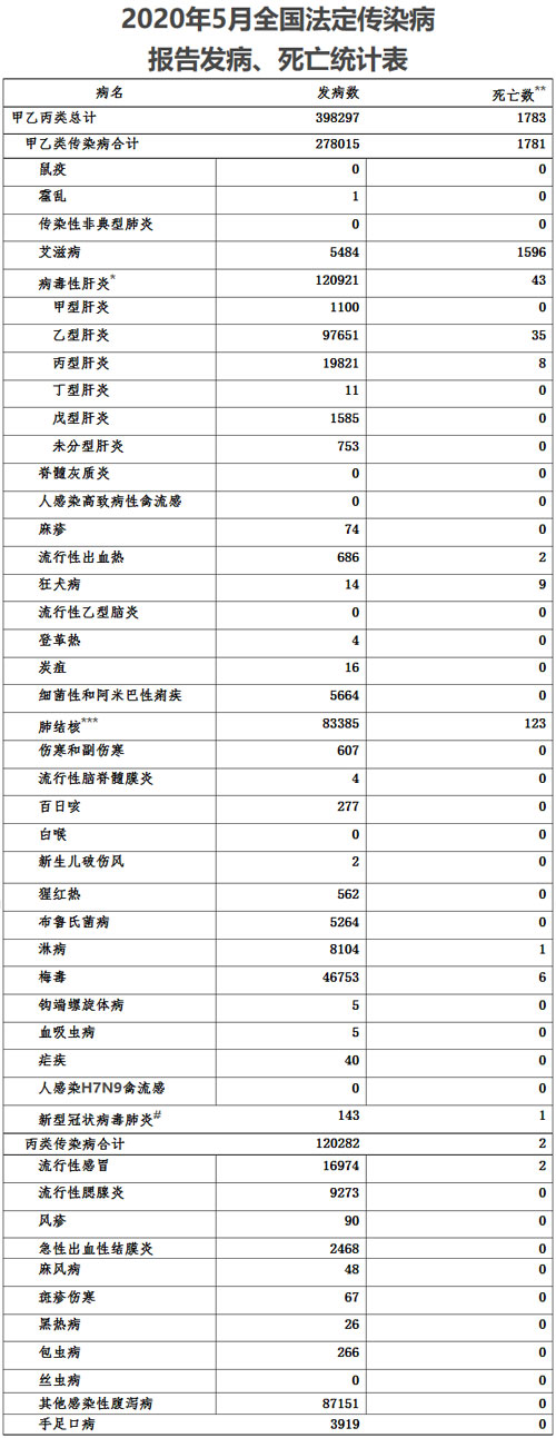 附件:2020年5月全國法定傳染病報告發(fā)病、死亡統(tǒng)計表