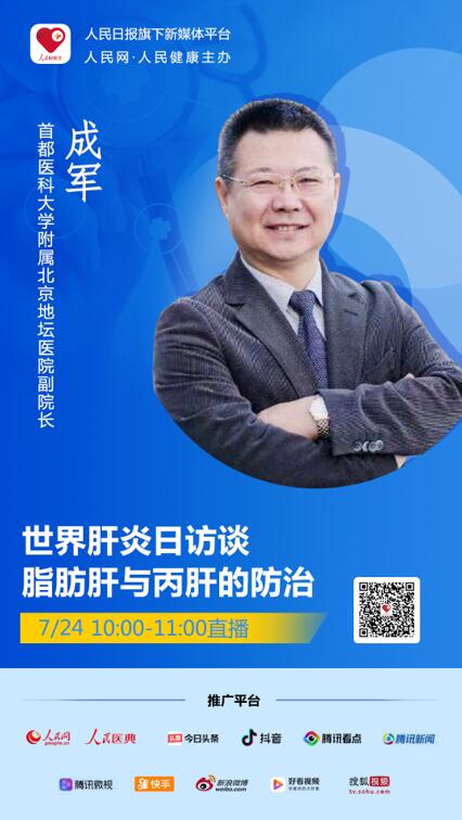 2020年7月24日 周五 10:00-11:00,人民日報社旗下新媒體“人民好醫(yī)生”客戶端將邀請首都醫(yī)科大學附屬北京地壇醫(yī)院副院長成軍教授進行視頻直播,為大家解答脂肪肝、丙肝防治相關問題,千萬不要錯過。