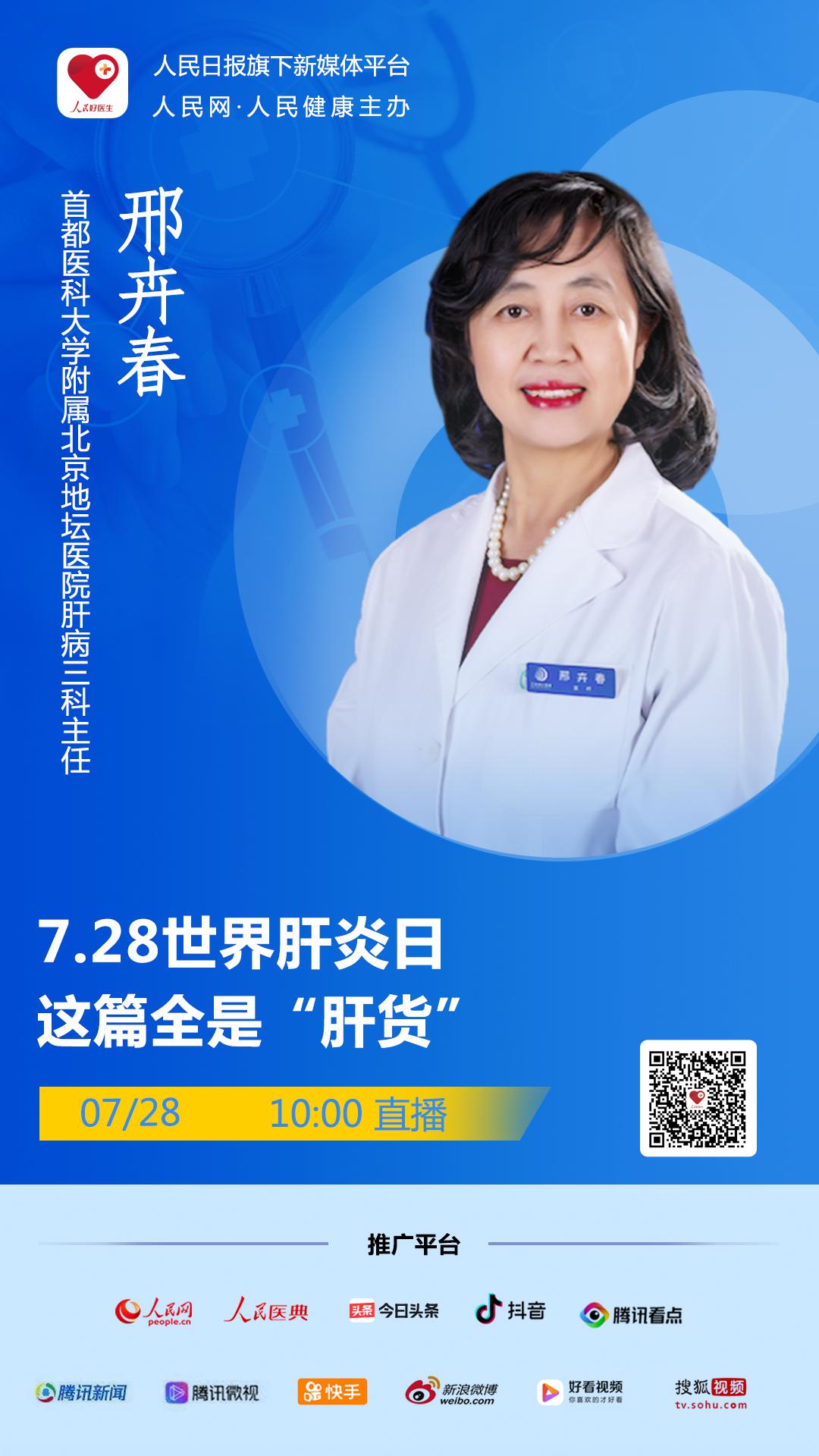 7月28日是世界肝炎日,人民好醫(yī)生邀請到首都醫(yī)科大學附屬北京地壇醫(yī)院肝病三科主任邢卉春教授做客人民日報社旗下新媒體“人民好醫(yī)生”客戶端,與大家在線分享滿滿的“肝貨”。