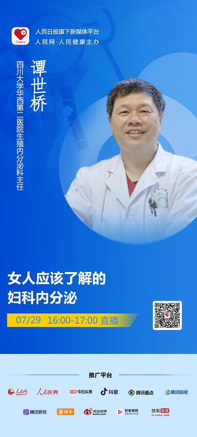 2020年07月29日(周三)16:00-17:00,“人民好醫(yī)生”客戶端將邀請(qǐng)四川大學(xué)華西第二醫(yī)院生殖內(nèi)分泌科主任譚世橋教授進(jìn)行視頻直播,為大家在線科普什么是婦科內(nèi)分泌,讓大眾了解婦泌疾病,千萬不要錯(cuò)過。