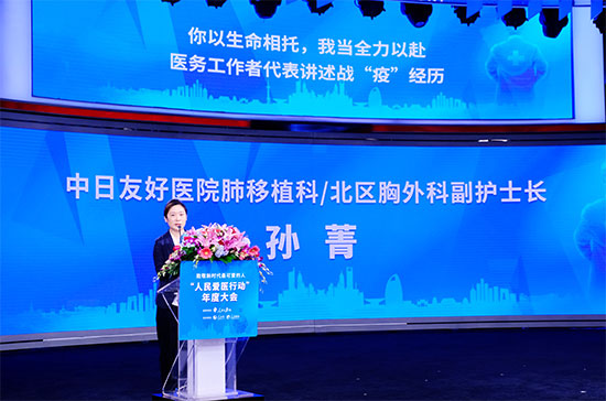 在大會(huì)“一線講述”環(huán)節(jié),全國抗擊新冠肺炎疫情先進(jìn)個(gè)人、中日友好醫(yī)院肺移植科副護(hù)士長孫菁講述了她的“戰(zhàn)疫”故事。
