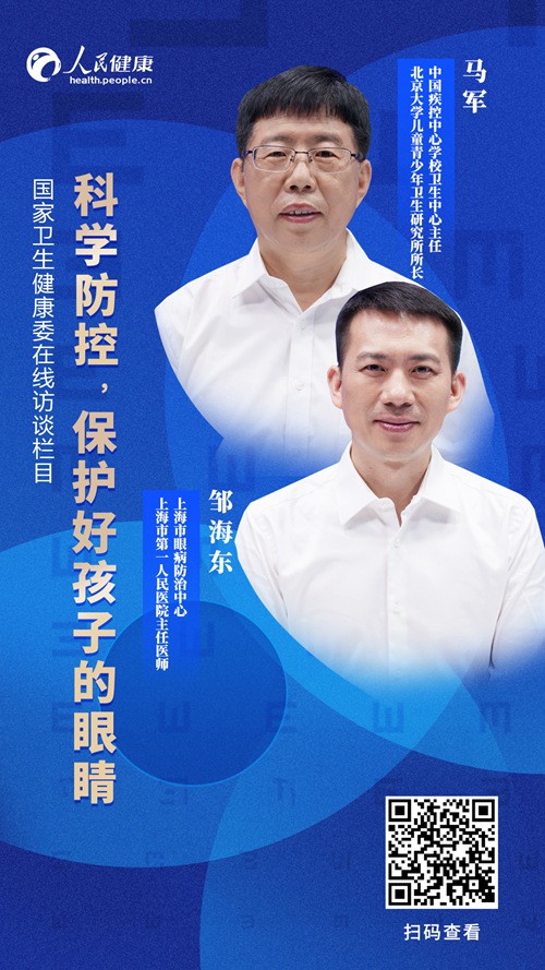 日前,人民網(wǎng)聯(lián)合國家衛(wèi)生健康委,邀請中國疾控中心學(xué)校衛(wèi)生中心主任、北京大學(xué)兒童青少年衛(wèi)生研究所所長馬軍,上海市眼病防治中心、上海市第一人民醫(yī)院主任醫(yī)師鄒海東,對于網(wǎng)友關(guān)心的學(xué)校關(guān)于近視防控采取的具體措施、高度近視的危害等問題進(jìn)行解答,同時呼吁大家從自身做起,利用學(xué)習(xí)到的相關(guān)科普知識,保護(hù)好眼睛。