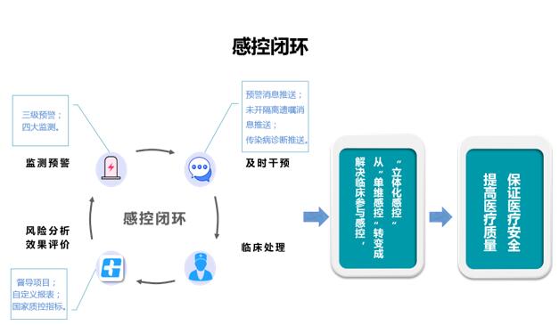 更換后的醫(yī)院感染實時監(jiān)控平臺,包括聚合四大專家知識庫、可提供三級預警、可進行隔離監(jiān)測、及時干預、統(tǒng)計分析和感控閉環(huán)六大功能。